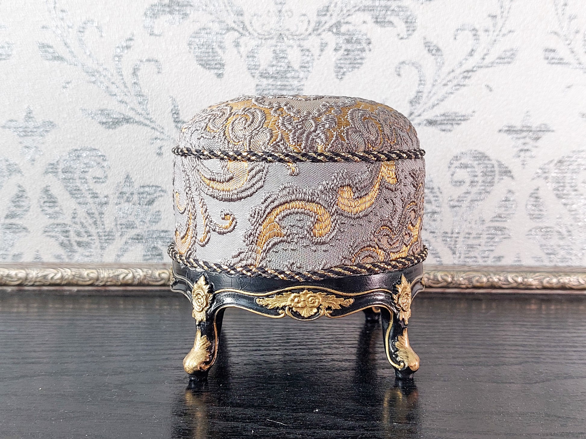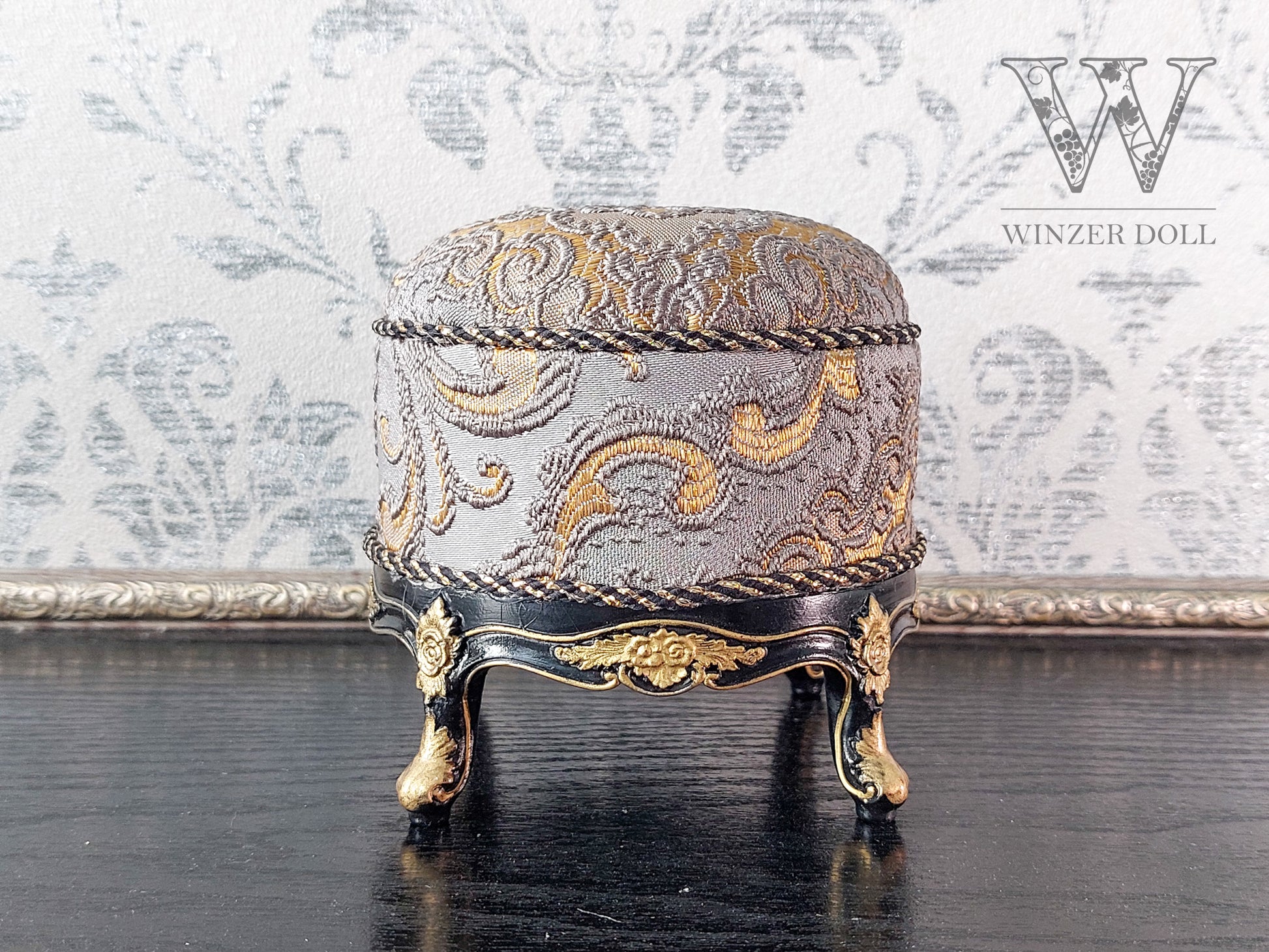 Baroque ottoman for dolls, black & gray