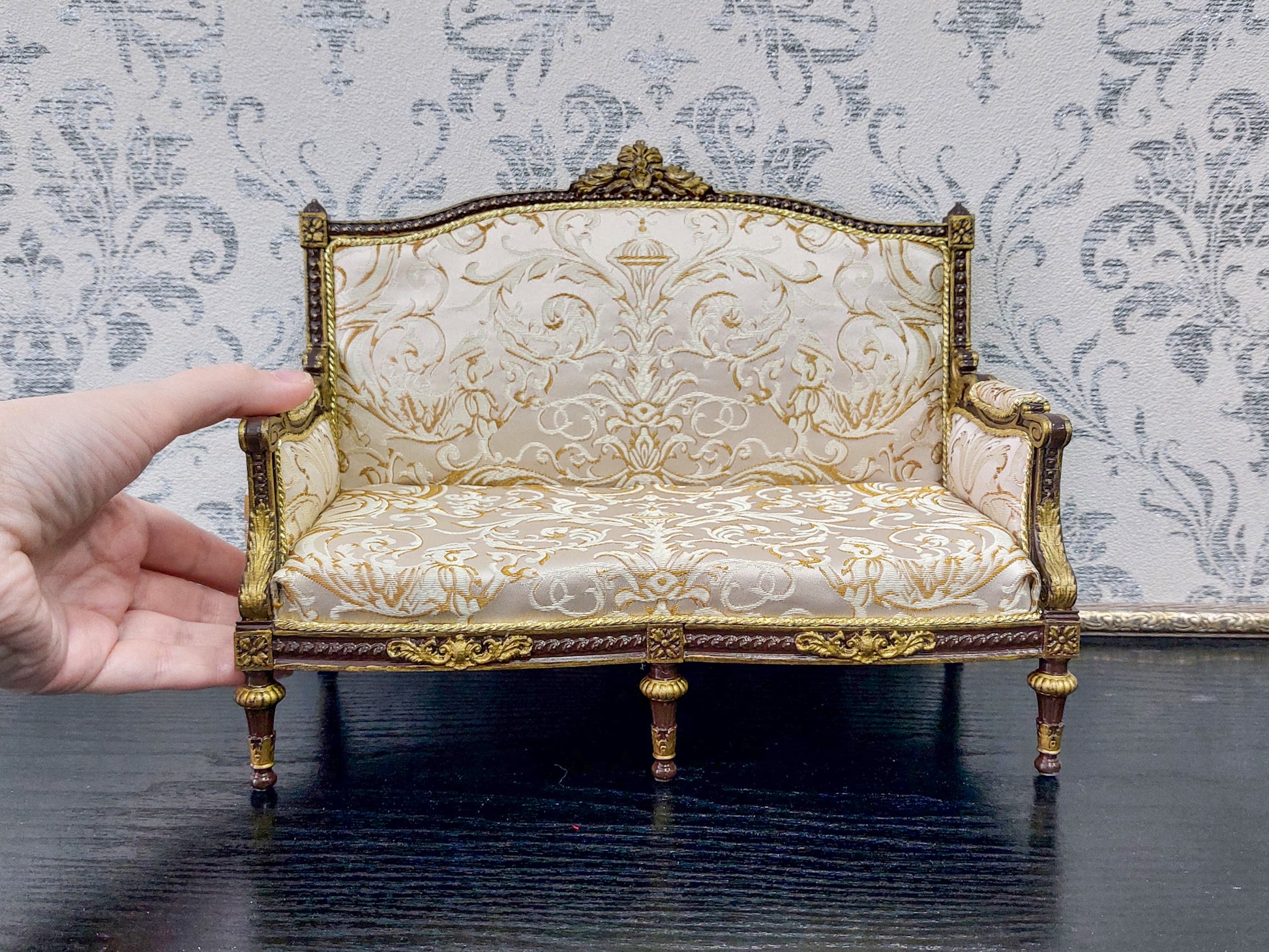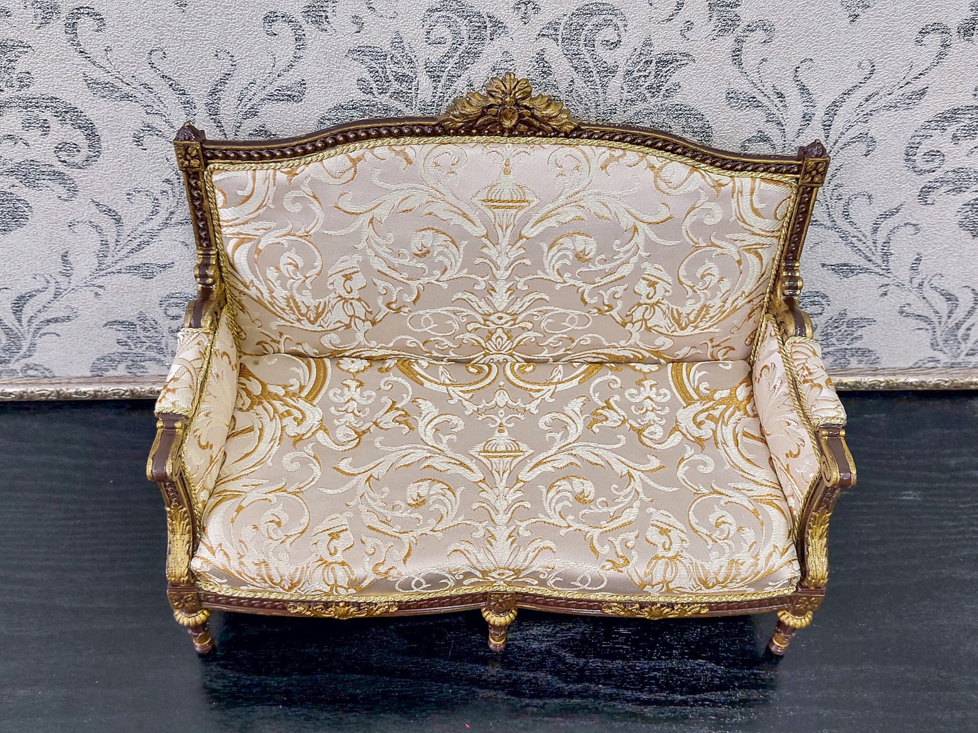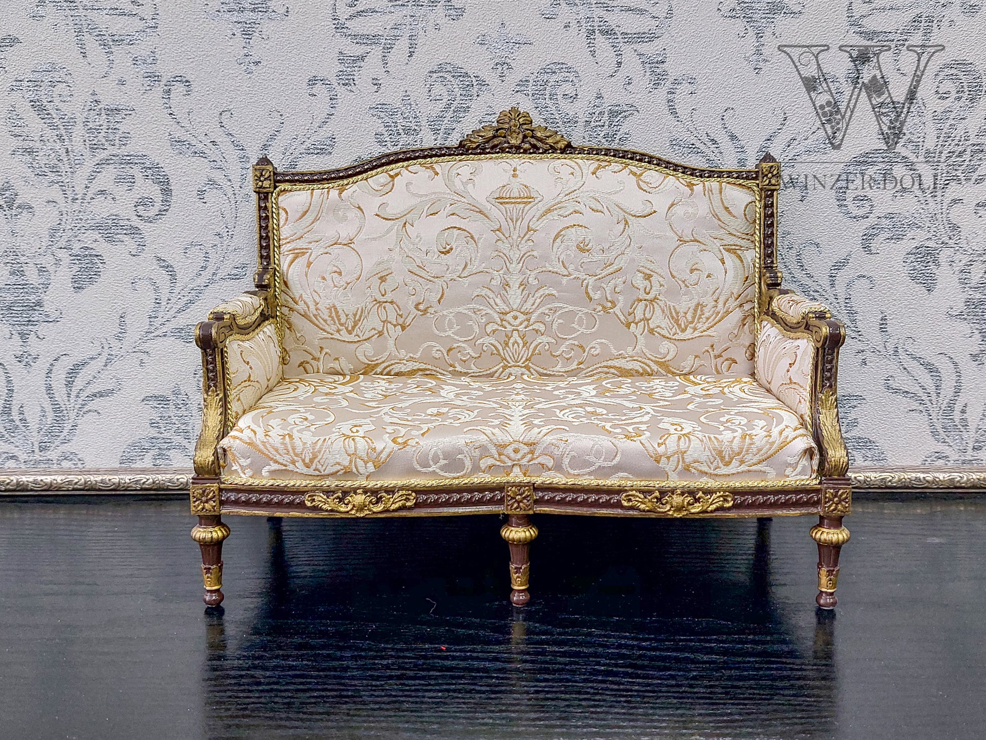 Classical sofa for dolls, Louis XVI style, brown & beige