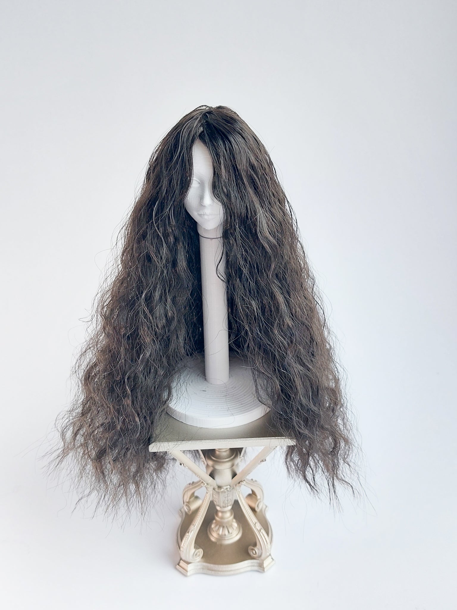 Wig long wavy, dark brown, for a doll by Winzerdoll. Synthetic silk.